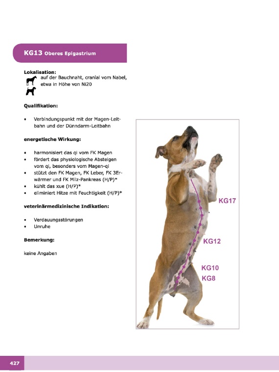 Die Beschreibung zu jedem Punkt umfasst genaue Angaben zur Lokalisation, Qualifikation, energetischen Wirkung, veterinärmedizinischen Indikation und ergänzende Bemerkungen.